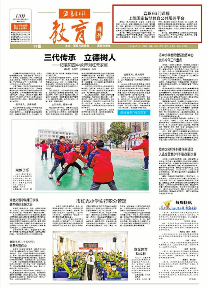 本报讯(通讯员杨明海 肖雪丽 全媒体记者周娜)4月6日,记者从襄阳职业技术学院(简称襄职)获悉,襄职首批66门在线开放课程在国家智慧教育公共服务平台上线。截至4月6日,襄职在线开放课程上线数量位居全省第一、全国高校前三名。