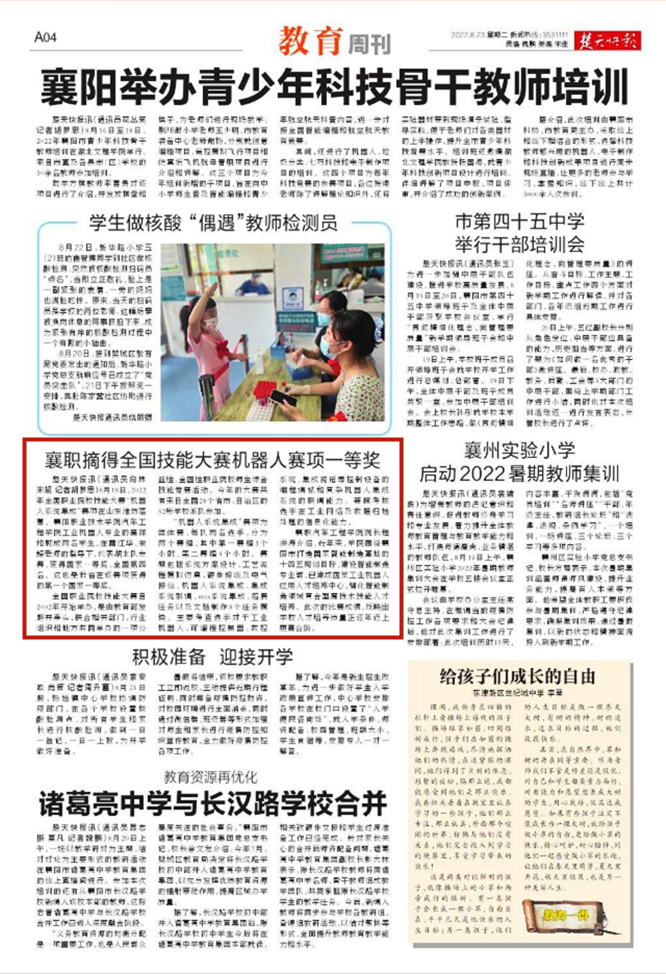 楚天快报讯(通讯员向炜 宋超 记者胡梦思)8月18日,2022年全国职业院校技能大赛“机器人系统集成”赛项在山东潍坊落幕。襄阳职业技术学院汽车工程学院工业机器人专业的高祥和郭成两名学生,在雷红华、宋超老师的指导下,代表湖北队参赛,获得国家一等奖,全国第四名。这也是我省在该赛项获得的第一个国家一等奖。