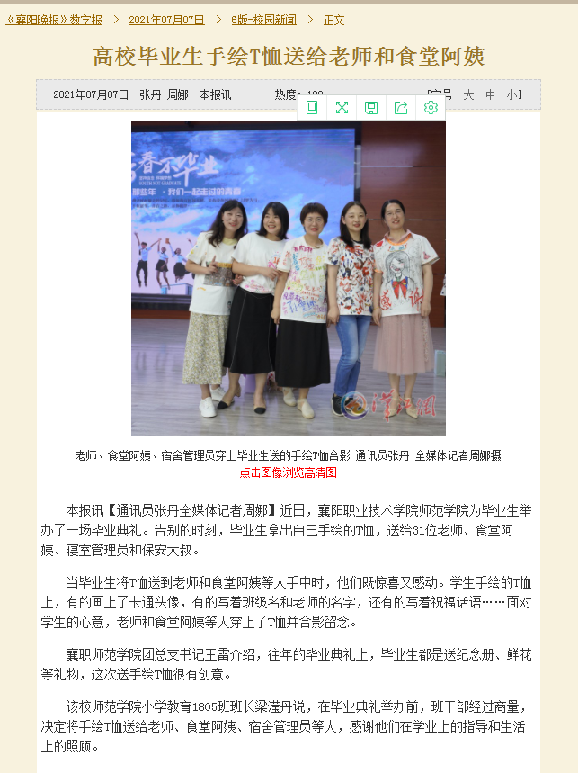 本报讯【通讯员张丹 全媒体记者周娜】近日,襄阳职业技术学院师范学院为毕业生举办了一场毕业典礼。告别的时刻,毕业生拿出自己手绘的T恤,送给31位老师、食堂阿姨、寝室管理员和保安大叔。