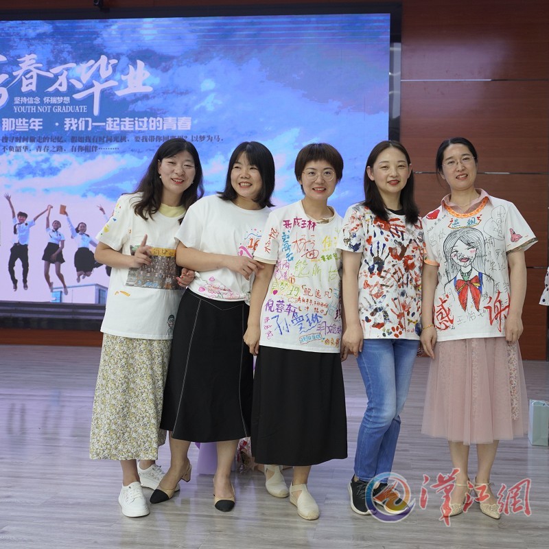 当毕业生将T恤送到老师和食堂阿姨等人手中时,他们既惊喜又感动。学生手绘的T恤上,有的画上了卡通头像,有的写着班级名和老师的名字,还有的写着祝福话语……面对学生的心意,老师和食堂阿姨等人穿上了T恤并合影留念。