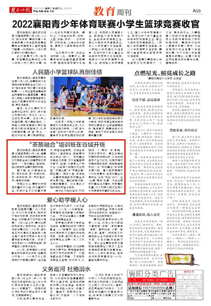 楚天快报讯(通讯员夏明康 记者胡梦思)8月11日,由襄阳职业技术学院和襄阳市农业农村局联合举办的高素质农民培训——“茶旅融合”培训班,在谷城县紫金镇花园村开班。