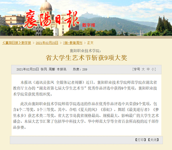 本报讯(通讯员张凤 全媒体记者周娜)近日,襄阳职业技术学院师范学院在湖北省教育厅主办的“湖北省第七届大学生艺术节”优秀作品评选中获得9个奖项。襄阳职业技术学院荣获优秀组织奖。