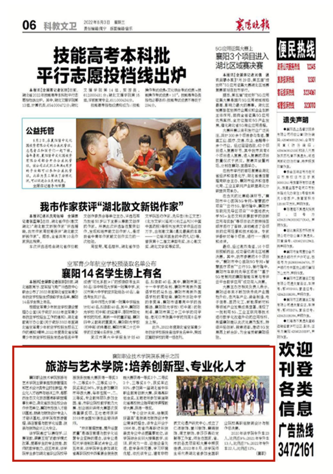 襄阳职业技术学院旅游与艺术学院主要承担旅游管理类和艺术设计类专业的创新型、专业化人才培养与培训工作,是鄂西生态文化旅游圈高职联盟理事长单位,湖北省旅游业校企合作示范单位,襄阳市旅游人才培训基地、服装与服饰设计专业人才培训基地。该学院有旅游管理、酒店管理与数字化运营、服装与服饰设计三大专业。