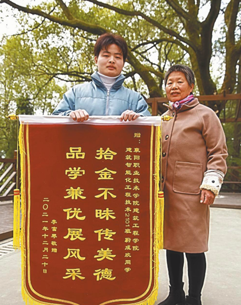 本报讯【通讯员耿玮易秋节 钱文生 全媒体记者周娜】12月20日,家住樊城区太平店镇的李富琴来到襄阳职业技术学院,给该校学生蔚成欣送来一面锦旗。
