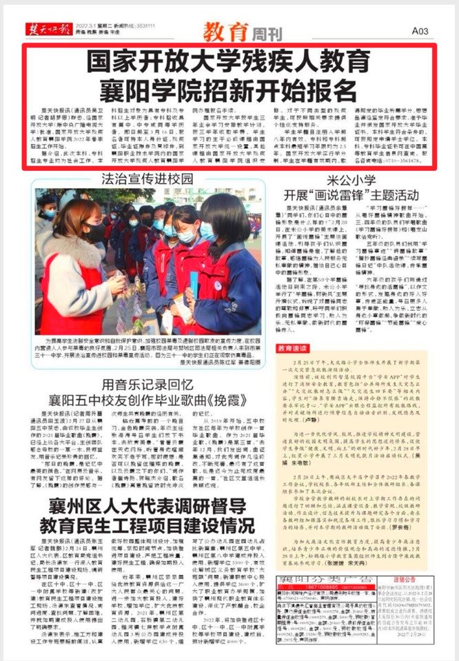 楚天快报讯(通讯员吴卫明 记者胡梦思)昨悉,经国家开放大学(原中央广播电视大学)批准,国家开放大学残疾人教育襄阳学院2022年春季招生工作开始。