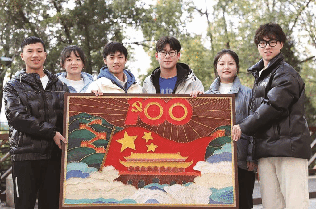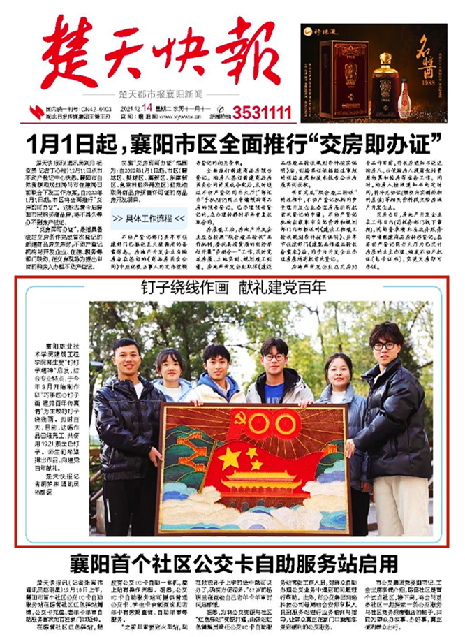 襄阳职业技术学院建筑工程学院师生受“钉钉子精神”启发,结合专业特点,于今年9月开始制作以“巧手匠心钉子画 建党百年传真情”为主题的钉子绕线画。历时百天,目前,这幅作品已经完工,共使用1921颗金色钉子。师生们希望捐出作品,向建党百年献礼。