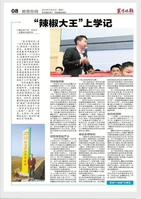 如今在襄阳,提起辣椒产业,很多人会想到杨利华。从最初喊他“辣椒王子”,到后来称呼他“辣椒大王”,杨利华的辣椒产业越做越大。2019年,他来到襄阳职业技术学院(简称“襄职”)农学院种植专业学习,成为了一名一村多名大学生计划(简称“一村多”)学员。入学这一年,他有哪些变化?来听听“辣椒大王”的故事。