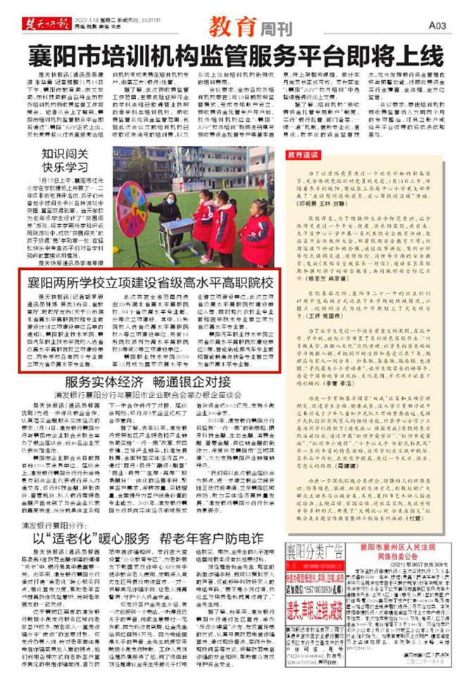 楚天快报讯(记者胡梦思 通讯员钟炜 易杰)近日,省教育厅、财政厅发布《关于公布湖北省高水平高职院校和专业群建设计划立项建设单位名单的通知》,襄阳职业技术学院、襄阳汽车职业技术学院均入选省级高水平高职院校立项建设单位,两所学校各有两个专业群立项为省级高水平专业群。